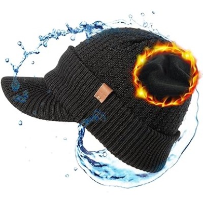 DryKnit™ Waterproof Visor Beanie Hat for Men – 50% Merino Wool Brim Cap, Fleece Lined Winter Hat for Big Heads