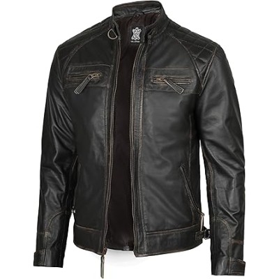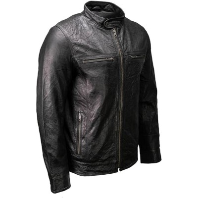 Real Lambskin Mens Leather Jackets - Quilted Cafe Racer Zip Up Moto Style Leather Jacket Men